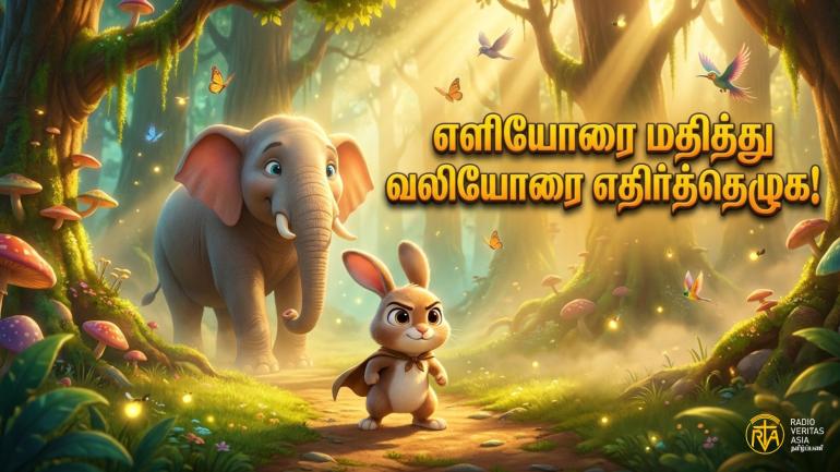 'யானையாரே, என்ன சொல்கிறீர்? எங்களுக்கு நீதி வேண்டும், மன்னிப்பு கேட்க வேண்டும். முயல் குட்டியின் பெற்றோருக்கு இழப்பீடு தரவேண்டும்' என்றது துடிப்புமிக்க ஓர் இளம் முயல்.
